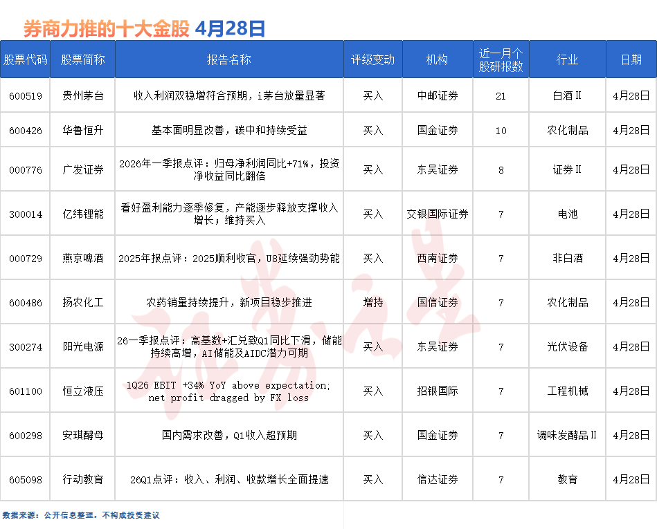 除了上述个股外,还有亿纬锂能、燕京啤酒、扬农化工、阳光电源、恒立液压、安琪酵母、行动教育等多股备受券商关注。